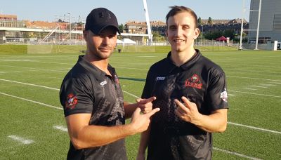 Sven Hammer und Jannik Nowak (rechts im Bild) sind beide als Spieler der Troisdorf Jets aktiv, verfügen aber auch über eine Menge Erfahrung als Trainer im Juniorenfootball. Sie waren für die Quarterbacks der orangenen U19-Auswahl zuständig. Der Kontakt zu den Dutch Junior Lions kam über Niko Chatziamanetoglu zustande, der dort als Coordinator die Geschicke der Offense leitet und dessen footballerische Heimat ebenfalls in Troisdorf liegt.