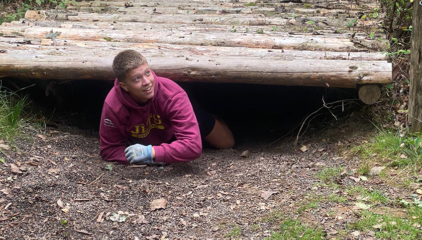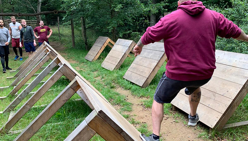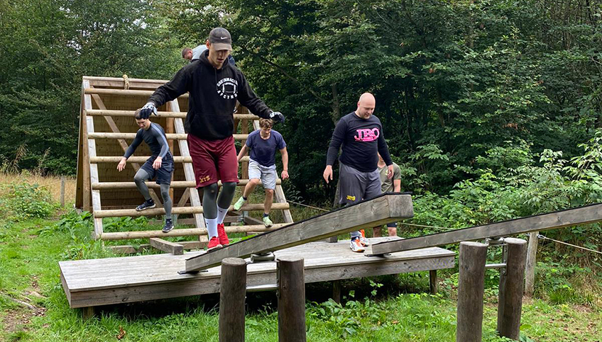 In zwei Gruppen aufgeteilt, stand dann zunächst das Aufwärmen an der frischen Luft mit den beiden Naturparcours-Coaches Lara und Jelle auf dem Programm. Nach einigen Vertrauensspielen, die, wenn man Footballspieler kennt, tatsächlich eine Menge Vertrauen erforderten, ging es dann zu den ersten Hindernissen.