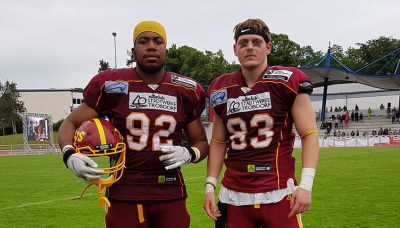 Dann holte sich auch die Jets-Defense eine mehr als verdiente Belohnung ab. Kurz nachdem Lucas Gunkel erneut einen Pass der Troisdorfer abfangen und an der eigenen 1 Yard-Linie sichern konnte, schlug Defense Tackle Nick Meyers im nächsten Spielzug dem Rostocker Quarterback den Ball aus den Händen. Am schnellsten reagierte nun Defense End Heisman Johnson (im Bild links), der sich in der Endzone auf den Ball warf und so mit seinen Teamkollegen einen coolen Touchdown feiern konnte (14:42, PAT Schwartz).