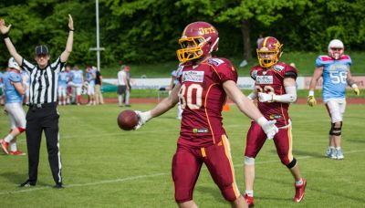 Zuerst bulldozerte sich Fullback Niklas Hornen in die Endzone der Gegner zum 28:24 und kurz darauf nutzte auch Quarterback Nowak den Vollgas-Schub seiner massigen Offense Line für den 35:24-Schlusspunkt (PAT beide Male Dennis Schwartz).