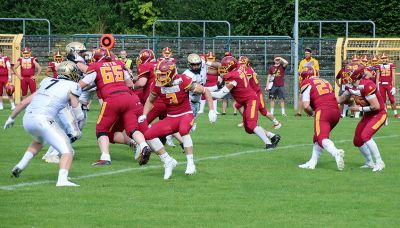 Der Saisonauftakt in Paderborn ging für die Roten mit 42:14 (14:7/14:0/14:0/0:7) verloren. Dabei agierten die Gastgeber, die anders als die Troisdorfer Footballer ein Vorbereitungsspiel absolvieren konnten, von Beginn an deutlich abgeklärter. Die Punkte für die Jets erzielten Running Back Aron Schüssler mit einem kraftvollen Lauf und Wide Receiver Jonah Glasner durch einen sehenswerten Pass von Quarterback Nick Schaper. Doch auch sie konnten nicht verhindern, dass die Dolphins schnell nach Punkten davonzogen und sich so am Ende mit einem ungefährdeten Sieg die Tabellenspitze sicherten.