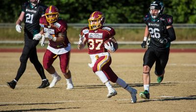 Nachdem den Jets zunächst weitere Punkte durch ein verschossenes Fieldgoal verwehrt blieben, sorgte der pfeilschnelle Nachwuchs-Running Back Niko Nikolakopoulos (Bild) mit einem Lauf über 36 Yards für den 28:7-Endstand (PAT Schwartz) und feierte damit seine Touchdown-Premiere im Herrenbereich.
