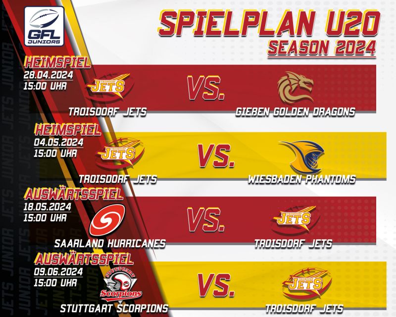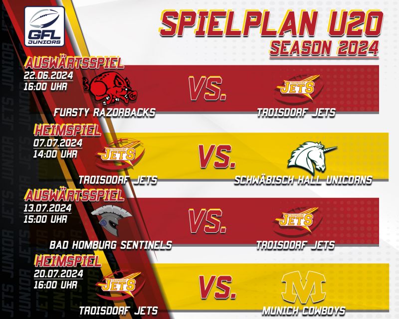 In der kommenden Saison wird die GFL-J erstmals als U20-Liga ausgetragen. Die Troisdorf Junior Jets werden in der Gruppe Süd auf Teams wie München, Fürstenfeldbruck, Stuttgart, Bad Homburg, Saarland, Schwäbisch Hall und Wiesbaden treffen. Der Startschuss fällt Ende April.