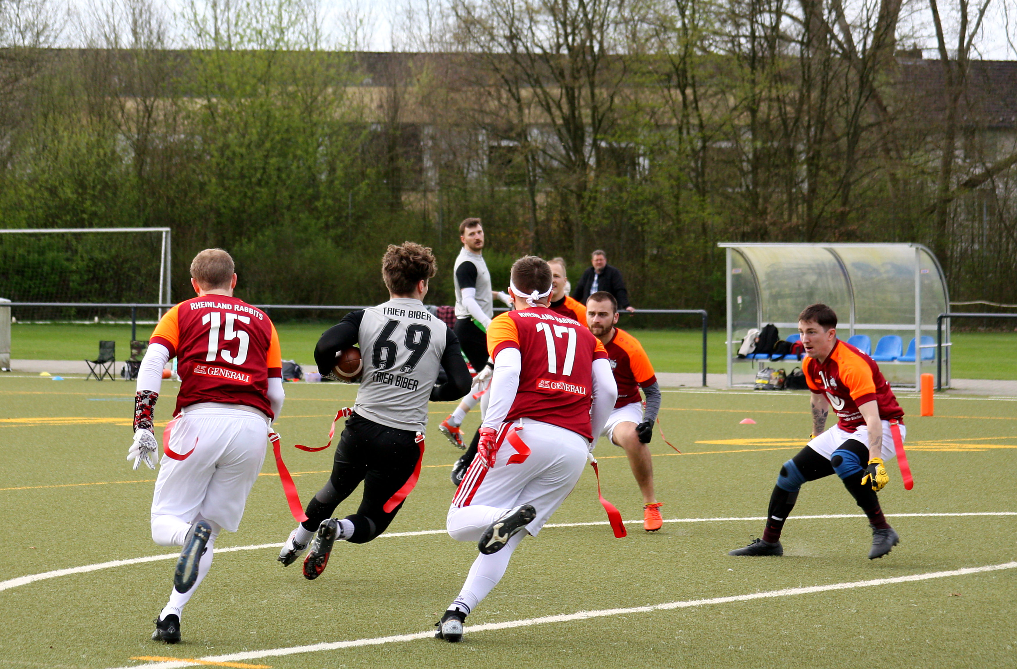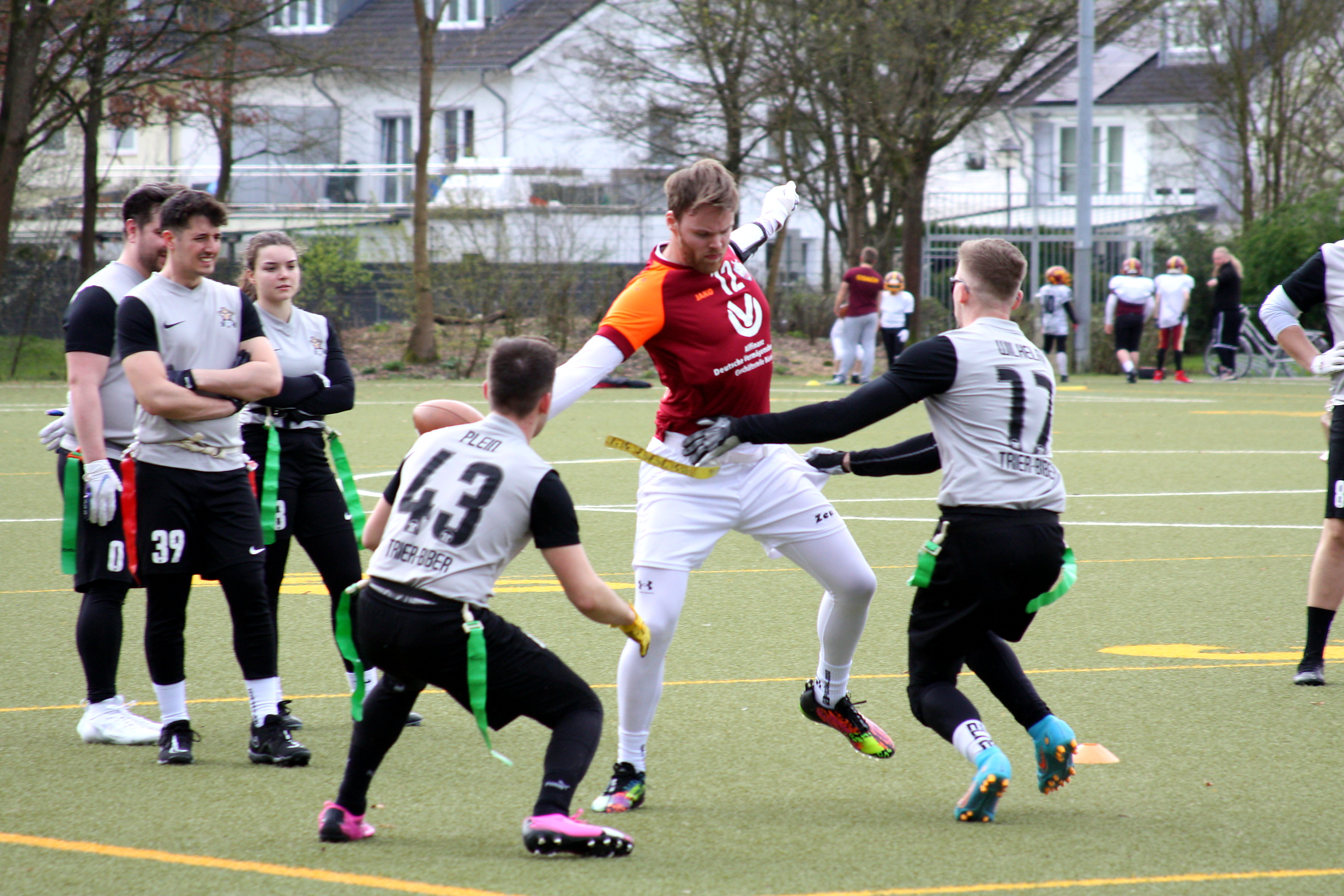 Der Tag begann mit einer anspruchsvollen Trainingseinheit am Vormittag, gefolgt von einer intensiven Videoanalyse und Teambuilding-Maßnahmen. Nachdem die Flag Jets sich aufgeladen hatten, stand am Nachmittag ein herausforderndes Scrimmage gegen die DFFL1 Mannschaft "Trier Biber" an, die mit nahezu voller Bundesligabesatzung antraten.