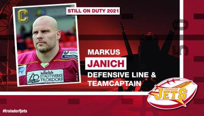 Seiner Rolle als Teamcaptain, in der er mit konstruktiver Kritik für die Weiterentwicklung der Mannschaft sorgt, wird Markus Janich von Jahr zu Jahr immer mehr gerecht. Als eines der Gründungsmitglieder des Fördervereins der Troisdorf Jets beweist er, wie sehr im „sein“ Verein auch über den eigentlichen Sport hinaus am Herzen liegt.