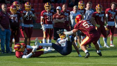 Dann folgte etwas, das man in einer anderen Sportart als „lupenreinen Hattrick“ bezeichnen würde, allerdings spielte hier weniger ein Tor eine Rolle, sondern eher der Quarterback der Cardinals. Defense End Frederic Huppers kämpfte sich durch die Offense Line der Gäste und streckte Lennart Brodeßer gleich dreimal in Folge nieder.