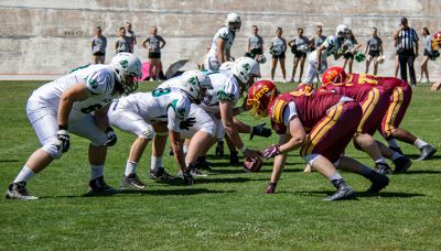 Ganz so kurz wollen wir dann doch nicht über das Spiel der JuniorJets berichten, auch wenn das Ergebnis wahrlich nicht zum Frohlocken einlädt. Am vergangenen Samstag reisten die JuniorJets leider stark dezimiert mit nur 26 Spielern nach Bielefeld, um gegen die heimischen Bulldogs anzutreten. Im Hinspiel konnten sich die jungen Jets noch mit 23:2 auf heimischem Geläuf bei milden Temperaturen durchsetzen. An diesem Tag jedoch war klar, dass das sehr heiße Wetter einen nicht unerheblichen Faktor darstellen würde. So entschieden sich die Head Coaches und der Whitehead der Begegnung, das Spiel in der alt-ehrwürdigen Radrennbahn durchzuführen. Hier ist das Spielfeld zwar sehr kurz und eingeengt, jedoch gibt es direkten Zugang zur Wasserversorgung; dies wäre auf dem sehr trockenen und harten Vorrasen des Geländes um die Radrennbahn nicht möglich gewesen.