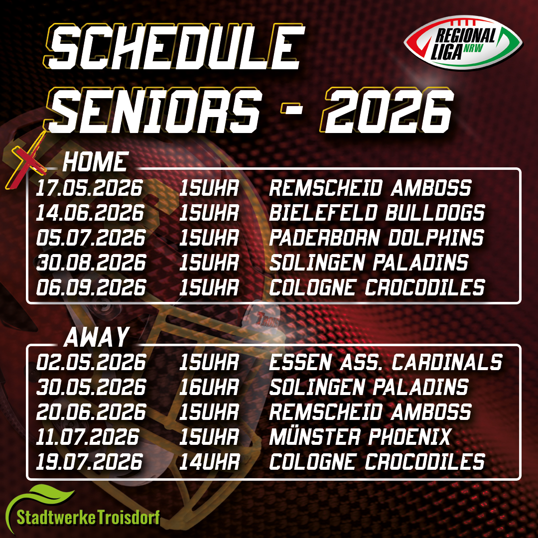 Der Spielplan für die Saison 2026 der Troisdorf Jets Seniors ist veröffentlicht. Die Herrenmannschaft blickt auf eine abwechslungsreiche Spielzeit mit bekannten Gegnern und neuen Herausforderungen.