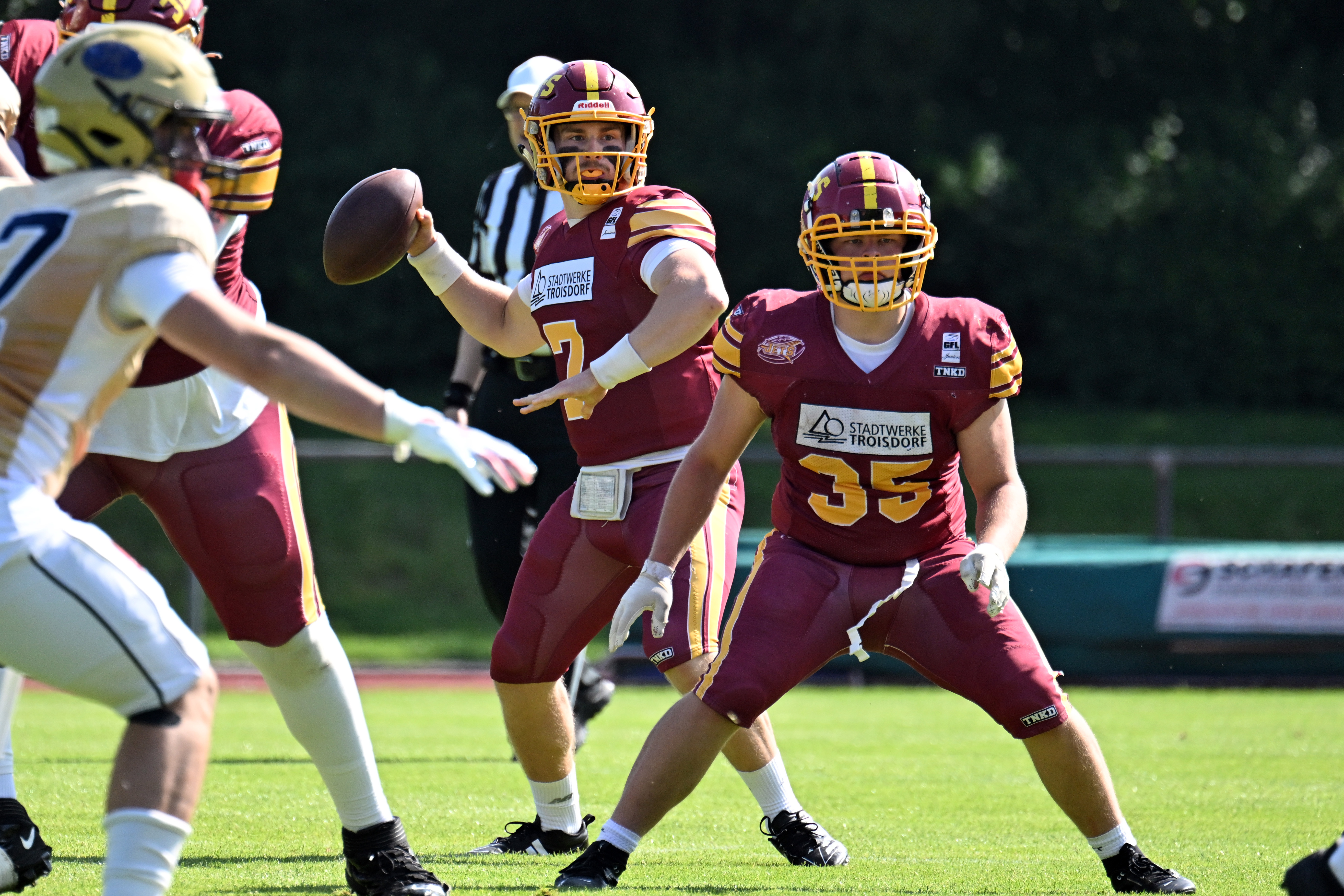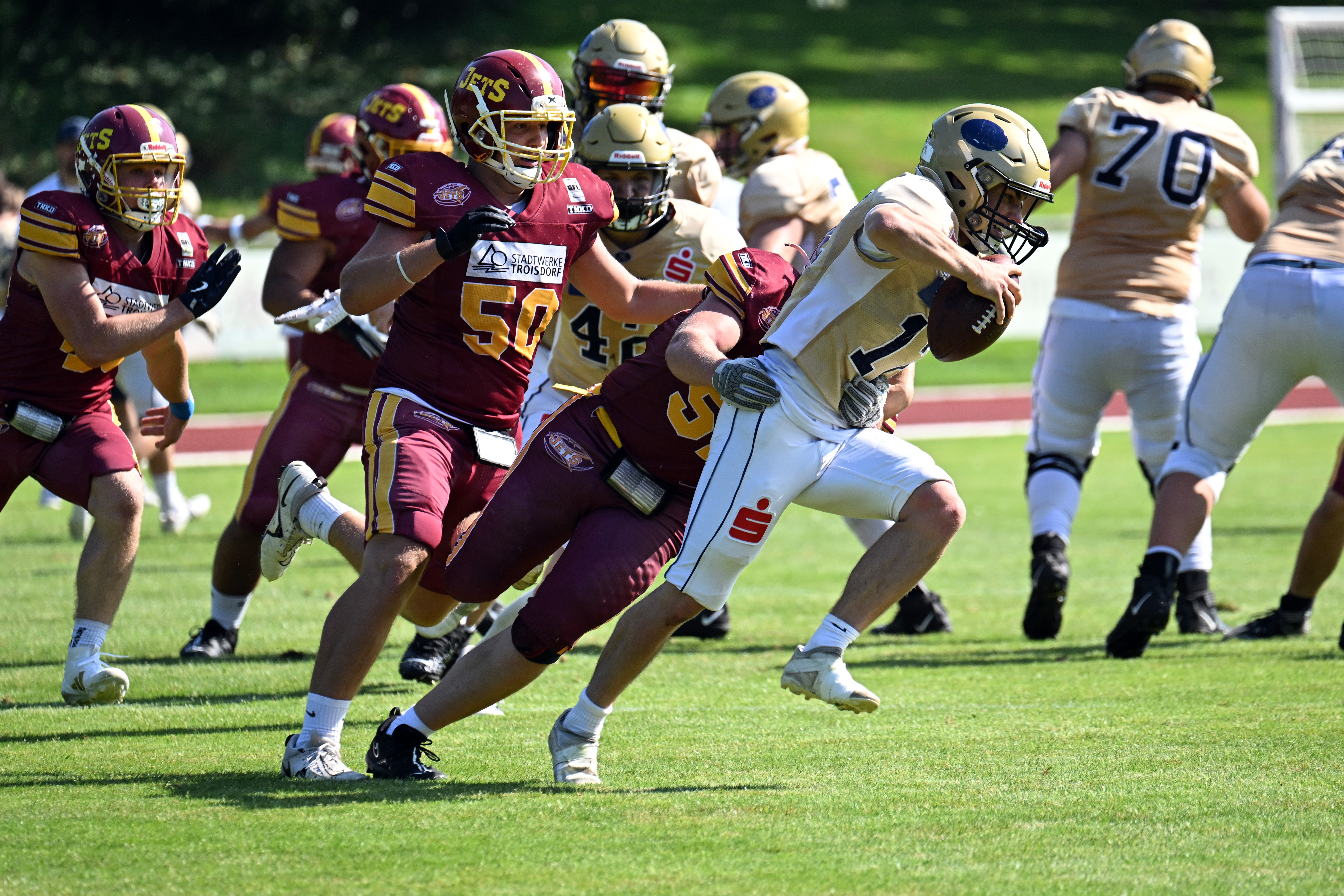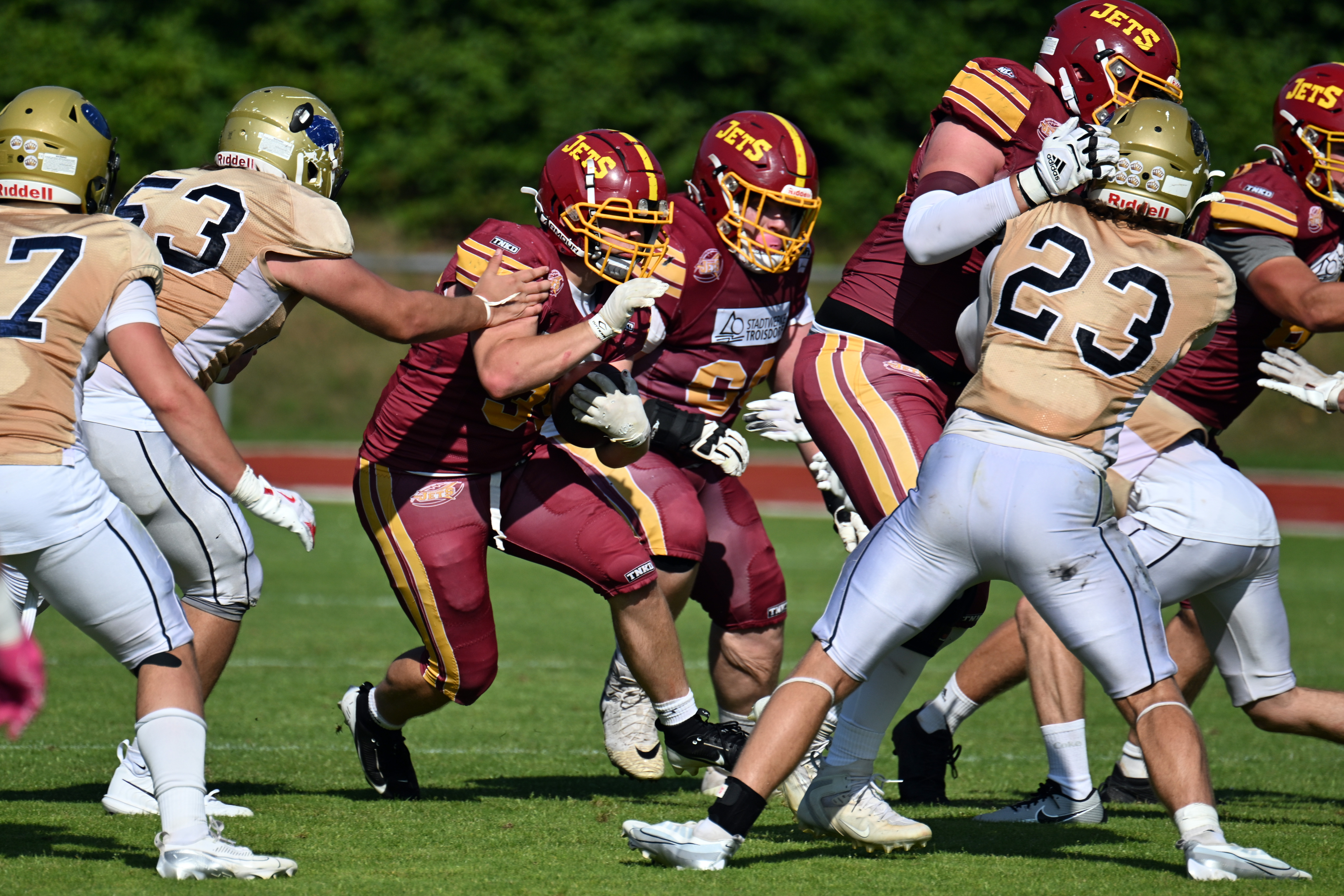Die JuniorJets haben im heimischen Aggerstadion mit 24:17 gegen die U20 der Dresden Monarchs gewonnen. Damit zieht die Troisdorfer U20 in das Halbfinale um die deutsche Meisterschaft ein und schreibt erneut Vereinsgeschichte: Nach einer ausgeglichenen Saison und dem Ausscheiden im Viertelfinale im vergangenen Jahr konnte das Team in dieser Spielzeit noch eine Schippe drauflegen. Nach einer starken Saisonbilanz von 7:1 Siegen folgte nun der verdiente Einzug in die nächste Playoff-Runde.